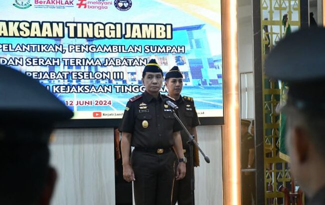 Selasa, 12 Juni 2024 pukul 09.30 WIB, bertempat di Aula Jaksa Agung R. Soerapto Lt. IV Kantor Kejaksaan Tinggi Jambi, Jambi Kepala Kejaksaan Negeri Jambi mengikuti Pelantikan, Pengambilan Sumpah dan Serah Terima Jabatan Eselon III di Lingkungan Kejaksaan Tinggi Jambi oleh Plt. Kepala Kejaksaan Tinggi Jambi, Riono Budisantoso, S.H., M.A.