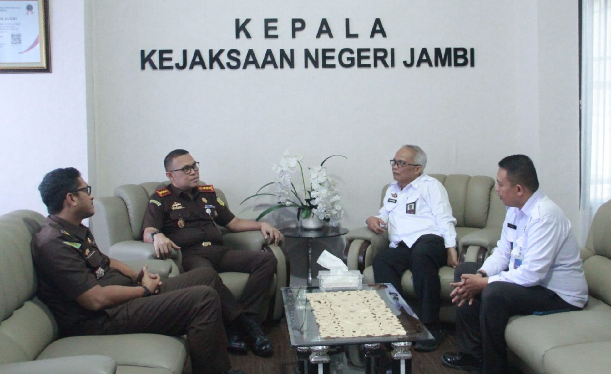 Kepala Kejaksaan Negeri Jambi, M.N. Ingratubun, S.H., M.H didampingi Kasi Pidum Kejari Jambi, Yoyok Satrio, S.H., M.H. menyambut baik kunjungan Kepala Lembaga Pemasyarakatan Kelas IIA Jambi, Batara Hutasoit BC.IP S.H beserta Kasi Binadik Lapas Jambi, M. Ading Saidhy, A.Md.IP., S.H.